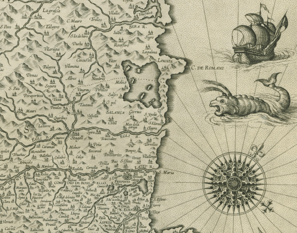 Vaixell, monstre marí i rosa dels vents a l’extrem superior dret del mapa, just davant de les costes del Rosselló.