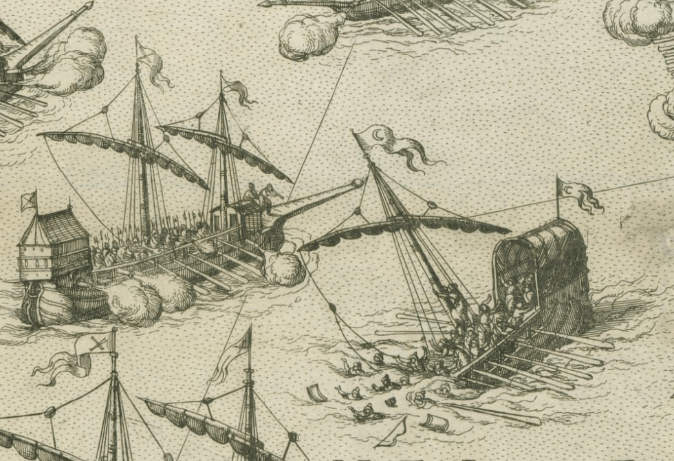 Detall de la batalla naval, amb una galera amb la creu de Sant Andreu disparant i una altra amb la mitja lluna enfosant-se.
