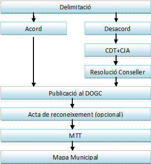 L’elaboració del Mapa Municipal de Catalunya encara està en marxa i està força avançat per aquestes contrades. El vessant topogràfic el du a terme l’Institut Cartogràfic i Geològic de Catalunya i el de caire administratiu ho porta la Direcció General d’Administració Local. El procés de delimitació és regit pel Decret 244/2007 i les seves modificacions posteriors. El resultat de les deliberacions de les comissions municipals és publica al DOGC i l’Institut Cartogràfic i Geológic de Catalunya s’encarrega d’elaborar la Memòria dels treballs topogràfics (MTT) de la línia de terme on hi consten les coordenades UTM de les fites i la trajectòria de la línia de terme que hi és compresa. Finalment, la delimitació completa d’un municipi comporta l’elaboració del document oficial, el seu Mapa municipal, el qual és sotmès a la Comissió de Delimitació Territorial (CDT) i s’inscriu en els diferents registres cartogràfics.