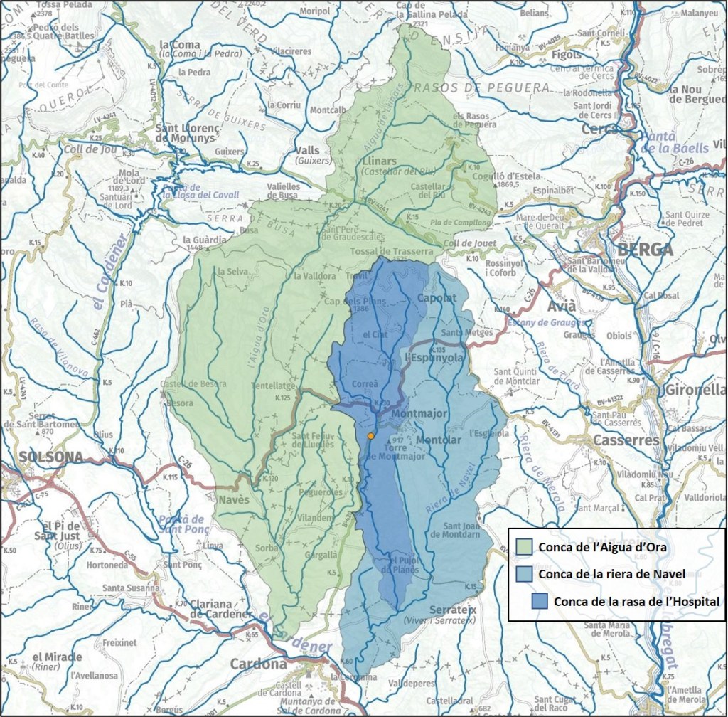 Les conques de l’Aigua d’Ora i de la riera de Navel tributen al Cardener per l’esquerra, molt aprop de Cardona (veure mapa inferior). Com el mateix Cardener, porten les aigües del Prepirineu cap al sud, fins unir-se al Llobregat prop de Manresa. Ambdues conques comparteixen carenes. La primera, la més occidental, és més extensa, 188 km2, i recull aportacions de més amunt, dels peus de la Serra d’Ensija, que arriba fins als 2300 m. La conca de Navel abasta uns 109 km2 i té els seus inicis a peus de la Serra dels Tossals, que supera per poc els 1520 m. La diferència d’altures de les seves capçaleres és important: l’Aigua d’Ora es pot aprofitar d’aportacions de la fossa de la neu mentre que per la riera de Navel la contribució nival és irrellevant. Tenen, per tant, règims de cabals diferents.