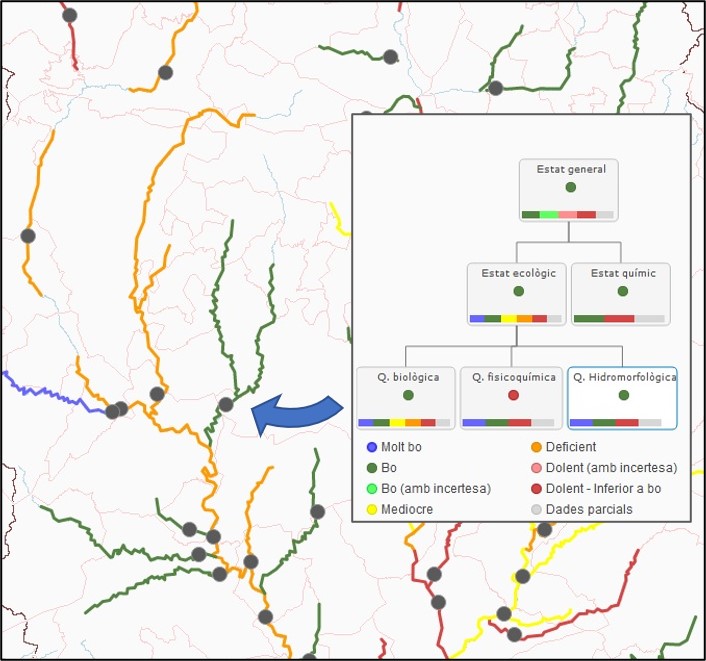 La salut de la conca no és bona. Al Pla de gestió del districte de conca fluvial de Catalunya 2016-2021 elaborat per l’ACA es conclou que pel que fa als continguts biològics l’estat és molt bo i la diversitat biològica és bona, però pel que fa als components fisicoquímics s’hi detecten altes concentracions de nitrats, la qual cosa fa que es consideri que l’estat o potencial hidrològic sigui mediocre, i, en general, que el seu estat es pugui classificar com a dolent. La conca, per tant, està sotmesa a proteccions per a la captació d’aigües pel consum humà. Sembla que l’excés de nitrats és degut a l’activitat agrícola. És un problema important. Com es pot observar a la figura inferior, l’informe de 2018 del Programa de Seguiment i Control de l’estat de les masses d’aigua de l’ACA insisteix en el mateix tema.