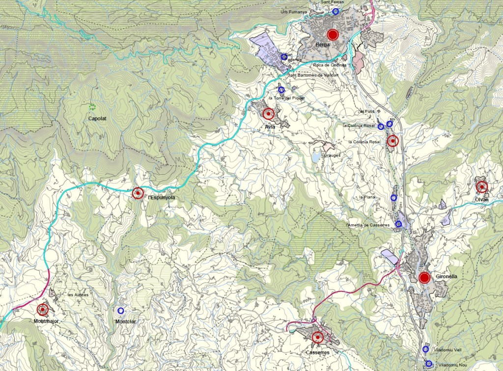 - bona part de la resta de poblacions se les ubica dins el grup on s’admet un creixement moderat, com és el cas de Navàs, Cardona i la Coromina, Avià, Cercs i Sant Jordi, Casserres, l’Espunyola, Montmajor, Puig-reig, Clariana de Cardener, Navès, i Freixinet, Su i Santa Susanna dins del municipi de Riner,